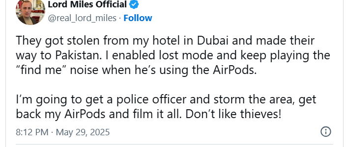 “দুবাইতে আমার হোটেল থেকে ওরা চুরি হয়ে গেছে এবং পাকিস্তানে চলে গেছে। আমি লস্ট মোড চালু করেছি এবং যখন সে এয়ারপডগুলি ব্যবহার করছে তখন “আমাকে খুঁজুন” নয়েজ বাজিয়ে রাখছি,” তিনি লিখেছেন।